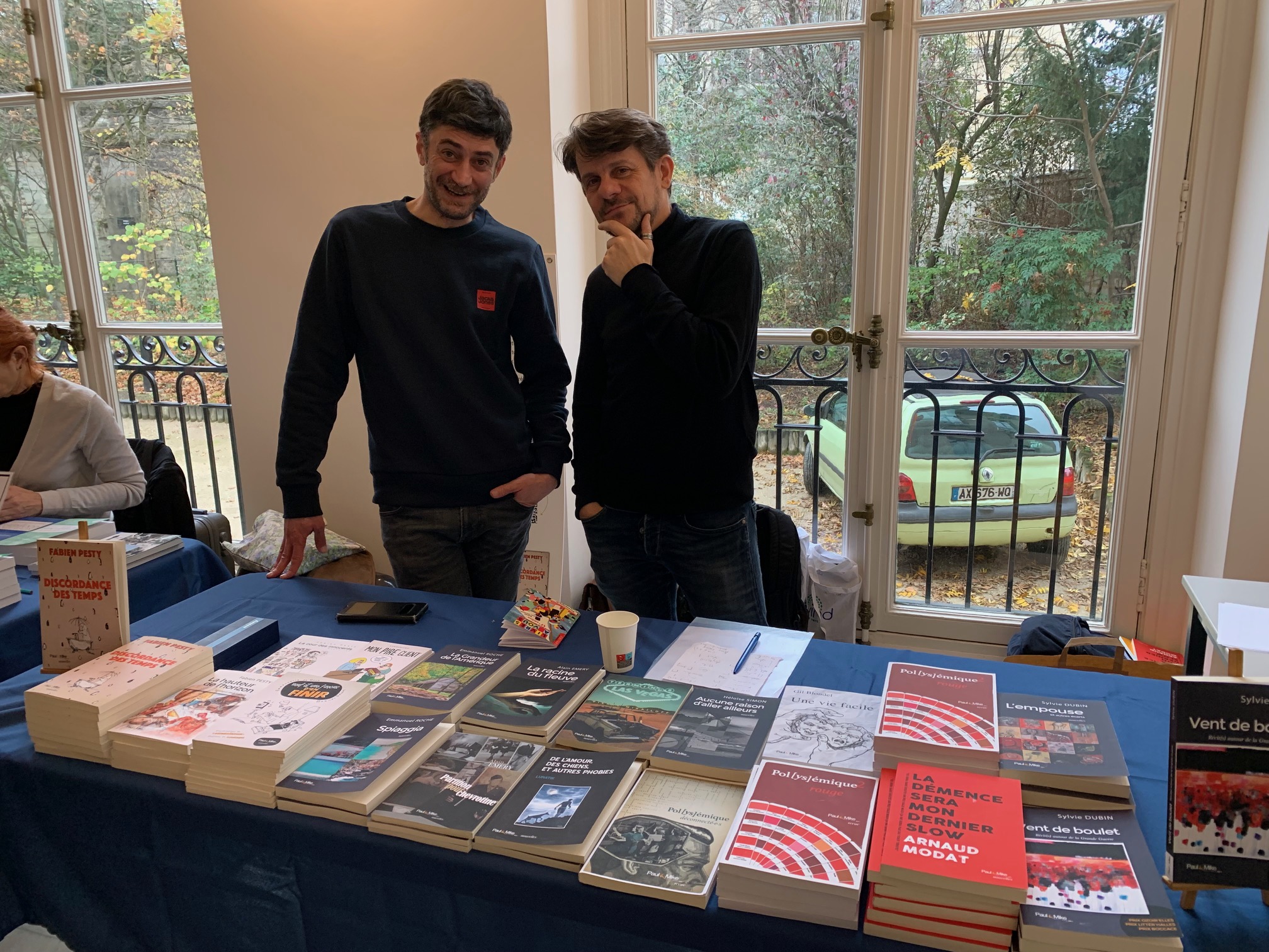 Mon objectif était de profiter de cette petite sauterie en quartier bourgeois pour croiser Paul&Mike qui avaient aussi fait le déplacement, histoire de tordre le cou aux suspicions de M. Ravera : « Mais tu es sûre qu’ils existent, ces gens qui ont dit qu’ils allaient te publier ? ». La mission fut un succès puisque je ramène pour preuve de leur existence une photographie de Fabien&Fabien que je dévoile ici – garantie sans IA, ni Photoshop ni même fond de teint.