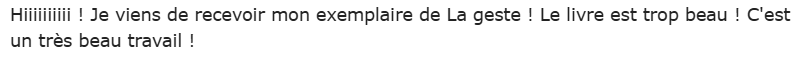 Et puis il y aura bien sûr ce que VOUS voudrez bien partager avec moi de votre lecture de La geste, de votre ressenti, de vos interrogations... Chaque critique, chaque chronique, sur n'importe quelle plateforme, rend plus tangible l'existence de ce livre et l'inscrit un peu plus dans la durée - surtout dans une époque où tout est volatile, s'oublie et disparaît...